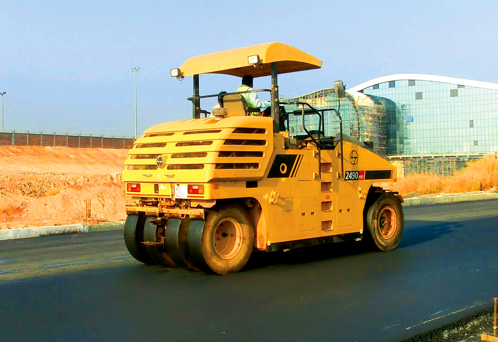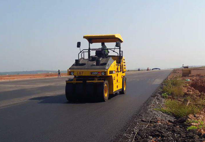 Machine compacting the bituminous concrete layer.